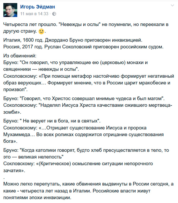 Сравнение, на мой взгляд, вполне корректное. Понятно, что Соколовский - ни разу не Джордано Бруно. Но судилище-то просто один в один.