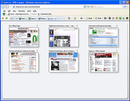 Пиктограммы можно убрать в меню справа - не совсем удобно, но мешают уже меньше. Меню можно вообще отключить, как установил и настроил ни разу не возникла в нём необходимость. Кстати, понравилась красивенькая панелька закладок. Впрочем, сразу видно - IE7 сделан исключительно ради красивостей и ничего революционного в нём нет. Opera милее. 😄
