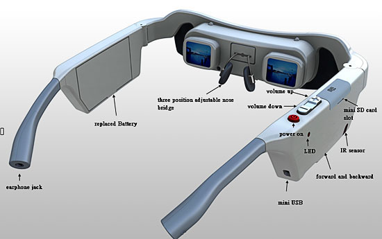 Видеоплеер в таких очках - штука хорошая, но вот видеокамеру бы.. можно даже стерео.. мечта! Фильм именно что глазами оператора. Носил бы не снимая..