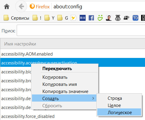 В адресной строке ввести about:config.