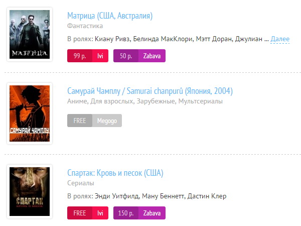 Итак, о самом сайте. Murkino.ru – это по сути одна страничка со списком фильмов, сериалов и прочего видео-контента, имеющегося в онлайн-кинотеатрах. Изначально они отсортированы по рейтингу IMDB. Можно отсортировать по рейтингу Кинопоиска и по дате появления фильма в базе кинотеатра (кнопка «Новинки»). На каждой строчке помимо информации о фильме (сериале, передаче и т.п.) есть кнопка, ведущая прямиком на просмотр в кинотеатре. На кнопке пояснение – какой кинотеатр и какие условия просмотра (бесплатно, за сколько-то денег, по подписке). Если фильм есть в нескольких кинотеатрах – кнопок несколько. Вот, например, сериал «Спартак. Кровь и песок» можно посмотреть на ivi.ru бесплатно или за 150 рублей на zabava.ru. А «Матрицу» на ivi.ru за 99 руб или на той же «забаве» за 50: