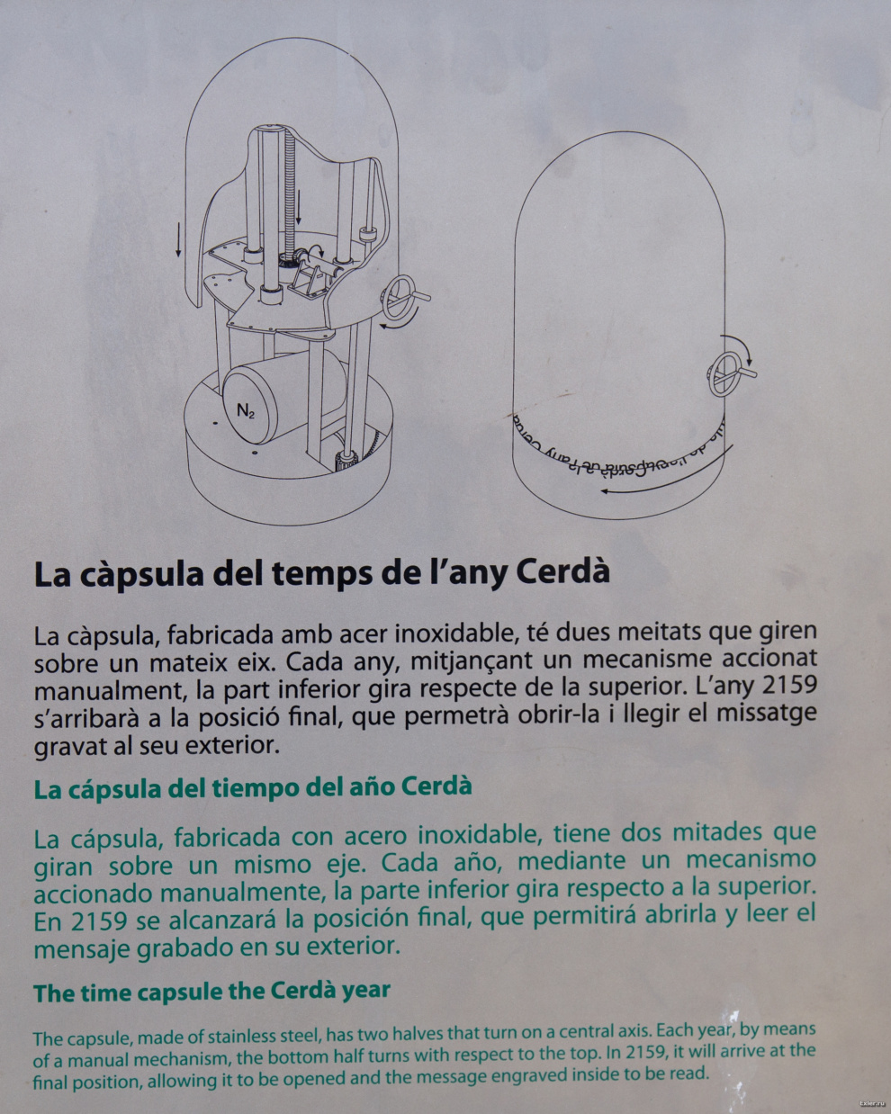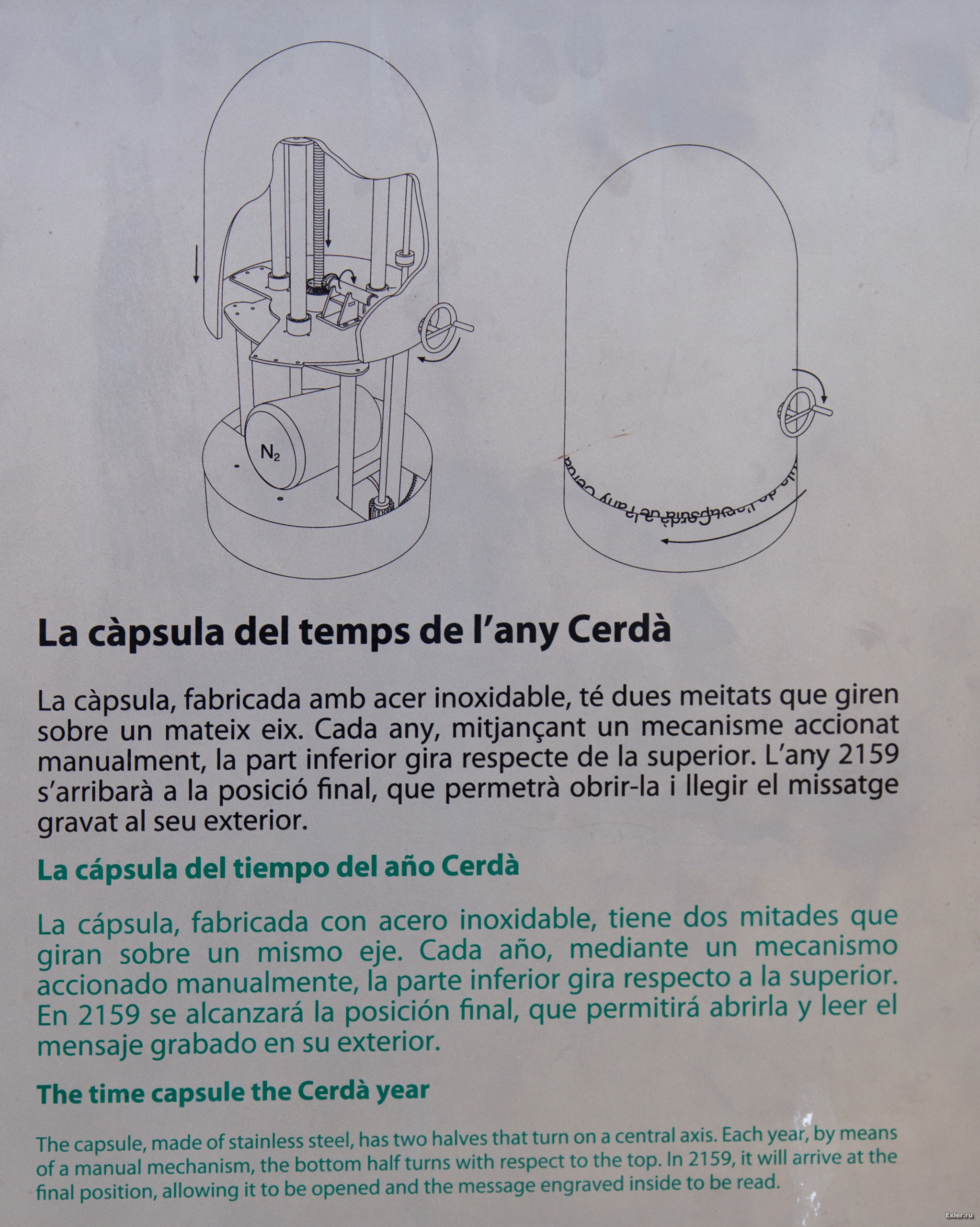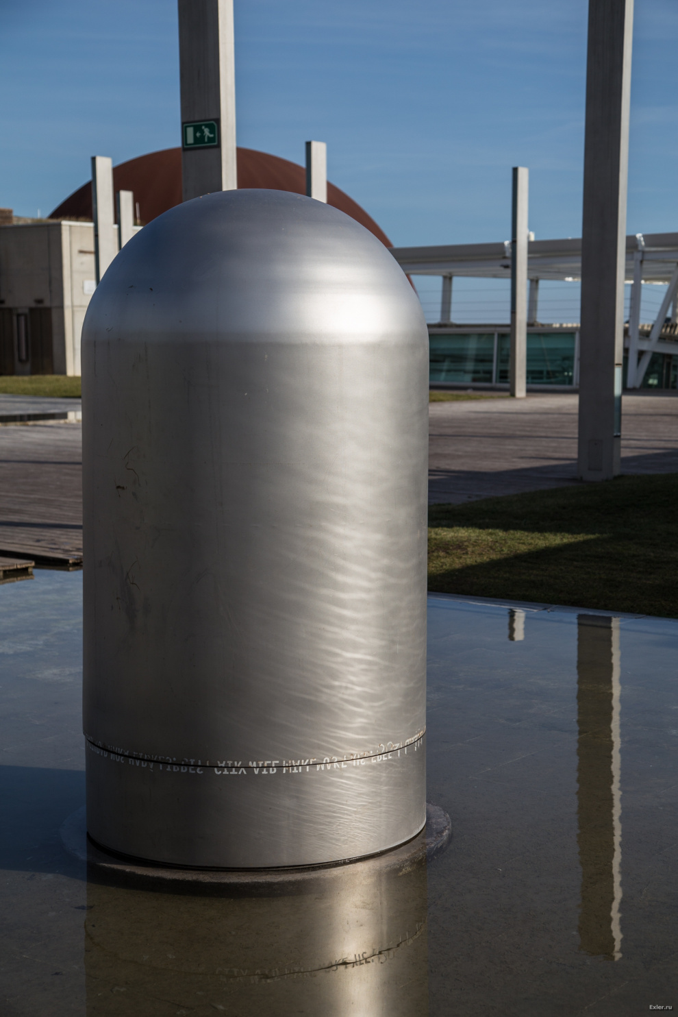 Капсула времени. Неимоверно научная штука. Каждый год специальной ручкой слегка поворачивается верхняя часть капсулы. Надпись, сделанная по ободу бандуры, разделена пополам между верхней и нижней частью. В результате к 2159 году буквы совместятся и надпись наконец-то можно будет прочитать. Блин, надо в календарике пометить: не забыть приехать и выяснить, что же там все-таки написано.