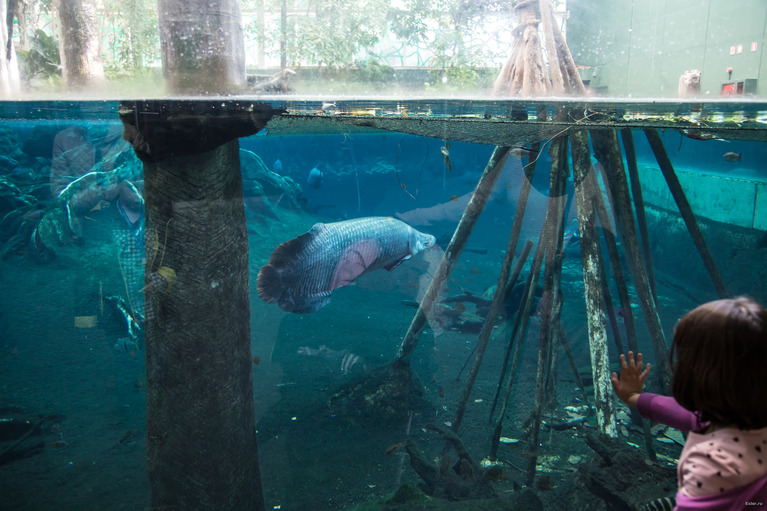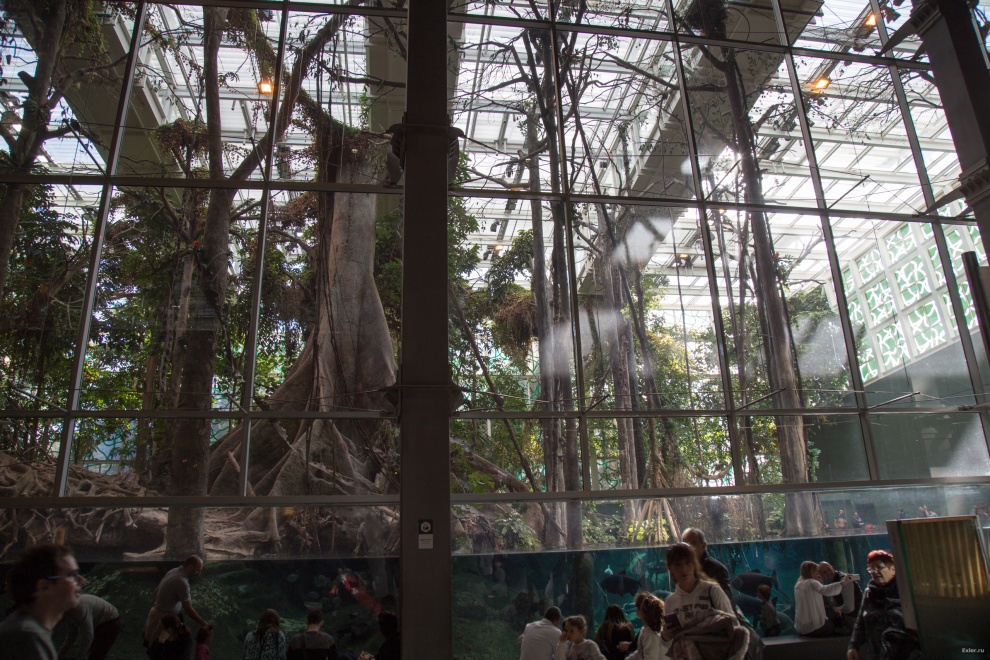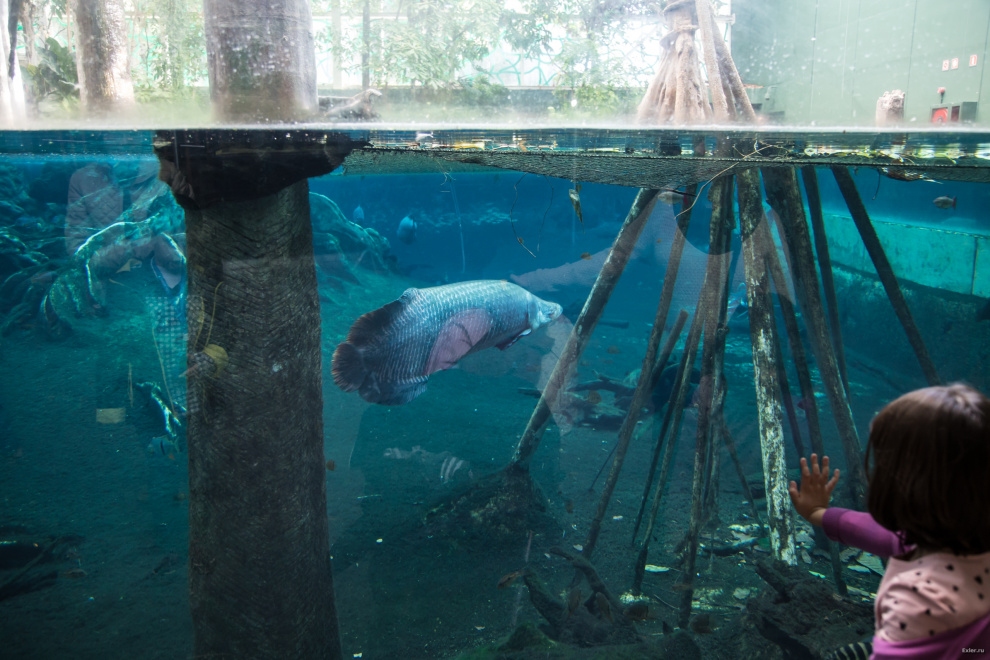 Нижняя часть джунглей представляет собой огромный аквариум, в котором плавает куча рыб. Этот аквариум отлично виден с торцевой стороны стенда, где можно любоваться как на джунгли, так и на рыбок в аквариуме.
