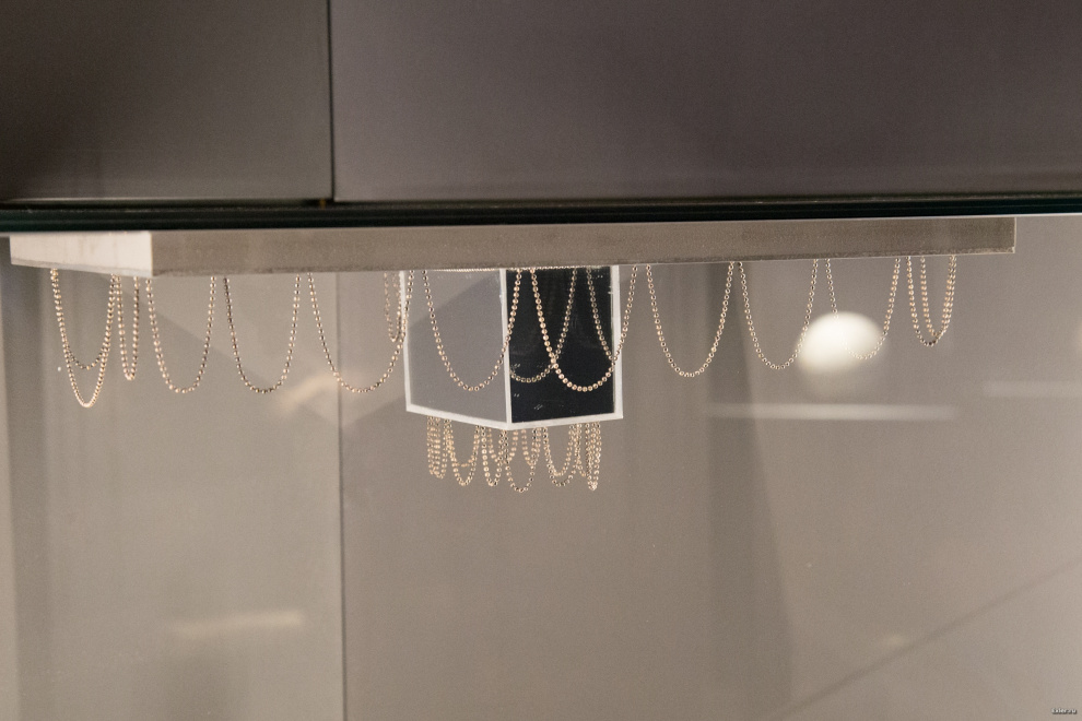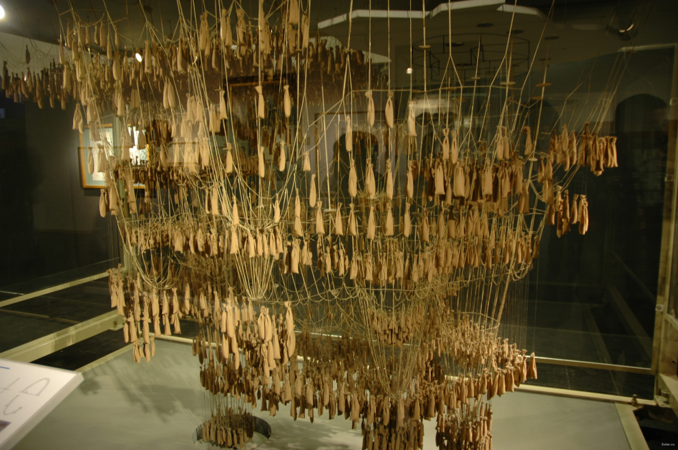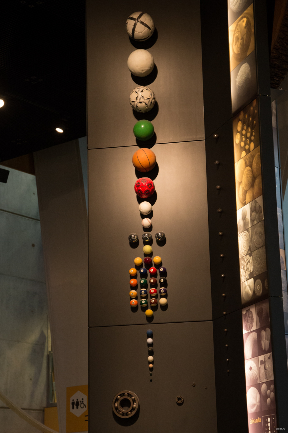 Там забавно оформлены высокие витрины со всякими тоже, можно сказать, коллекциями. Вот мячики и шарики.