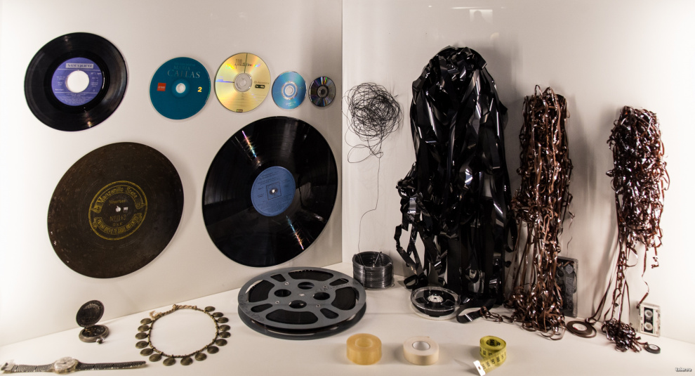 Носители аудиоинформации от доисторических веков в виде проволоки до современных дисков, которые давно уже устарели, на самом деле. Коллекцию делали в 2005 году, с тех пор много чего изменилось.
