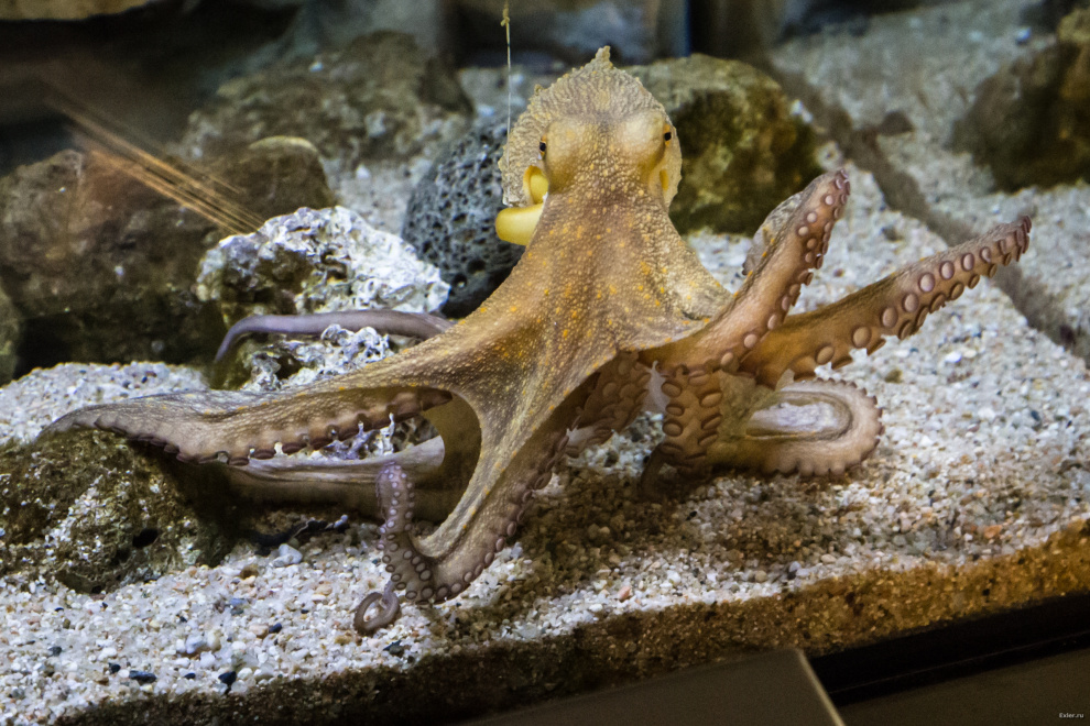 Любимец публики осьминог Петя. Почему-то находится в центре зала, а не содержится рядом с остальными крабиками-рыбками.