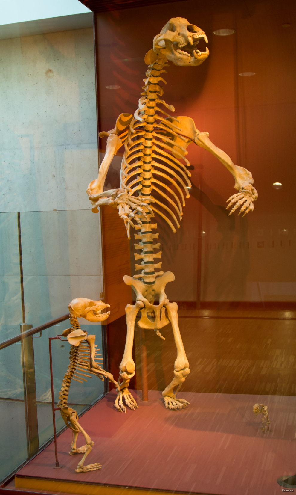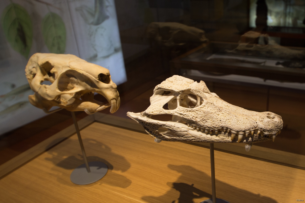 Впереди - череп крокодила, позади - череп саблезубой белки.