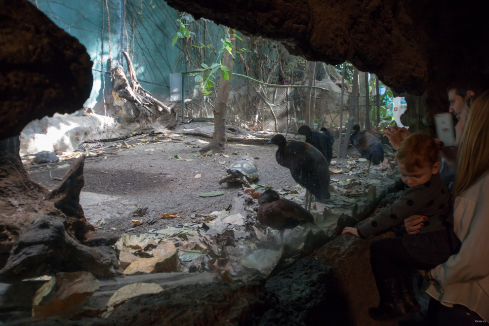 Птички безучастно наблюдают за тем, как одна черепашка пытается взгромоздиться на другую. У детишек это действо вызывает значительно большее оживление.