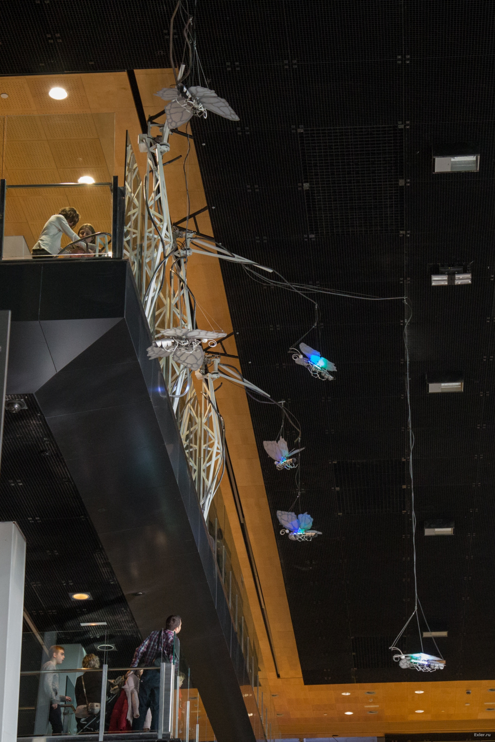 На верхнем этаже есть любопытные установки, с помощью которыми можно управлять вот этими птичками. Там все время толпятся дети, развлекаются.