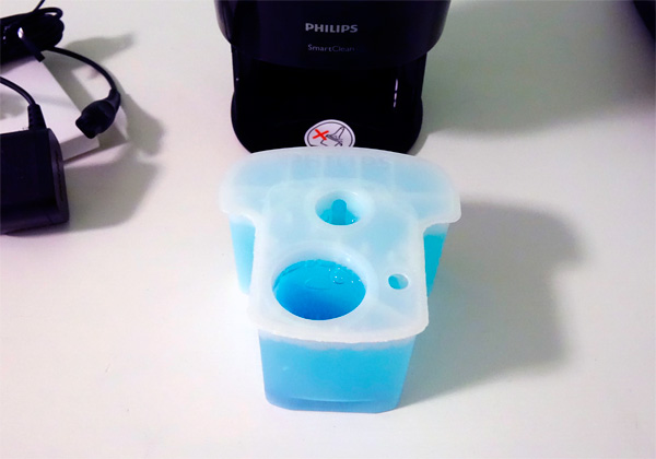 Контейнер с жидкостью для воды: с него снимается защитная пленка, контейнер вставляется в очистной крэдл и крэдл опускается.