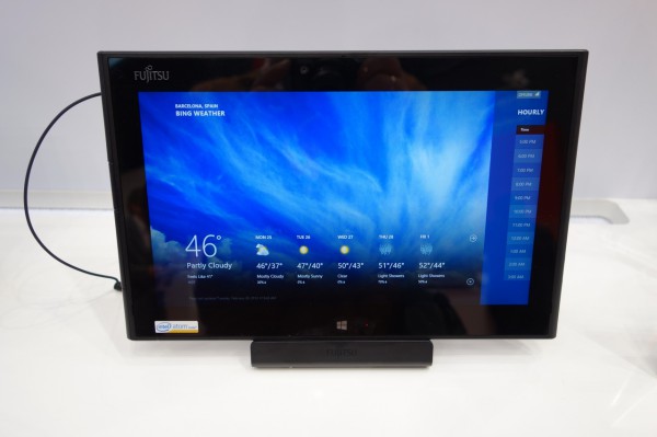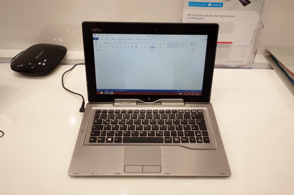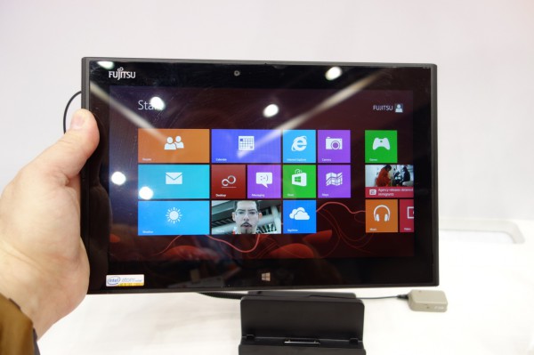 На стенде Fujitsu показали очень интересный планшет на Windows 8 Pro - Fujitsu Arrows Tab Q582/F. Главная особенность планшета заключается в том, что он - влаго- и пылезащищенный. При этом очень тонкий - 9,9 мм в толщину. Вес - 584 грамма. Дисплей 10,1”, IPS-матрица со светодиодной подсветкой, разрешение 1366 x 768 (аналогичный планшет от Fujitsu на Tegra 3 имеет разрешение Full HD).