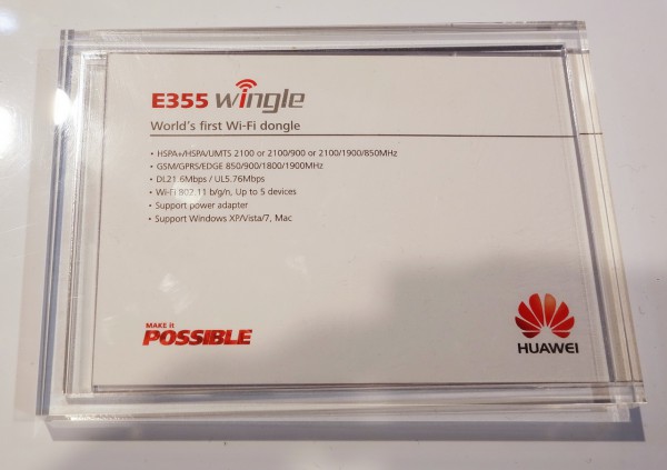 Wi-Fi донгл E355 Wingle. Написано, что первый в мире донгл с поддержкой HSPA+ и Wi-Fi 802.11a/b/g/n. В него вставляется мобильная симка, после чего донгл превращается в точку доступа Wi-Fi. Вообще подобные штуки - раздачу мобильного Интернета по Wi-Fi - сейчас делают очень многие смартфоны.