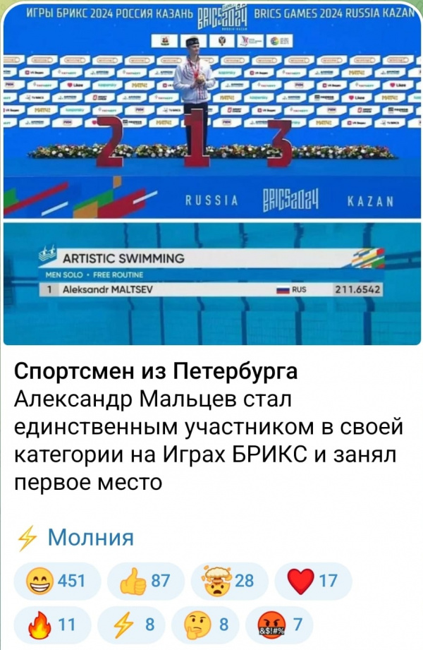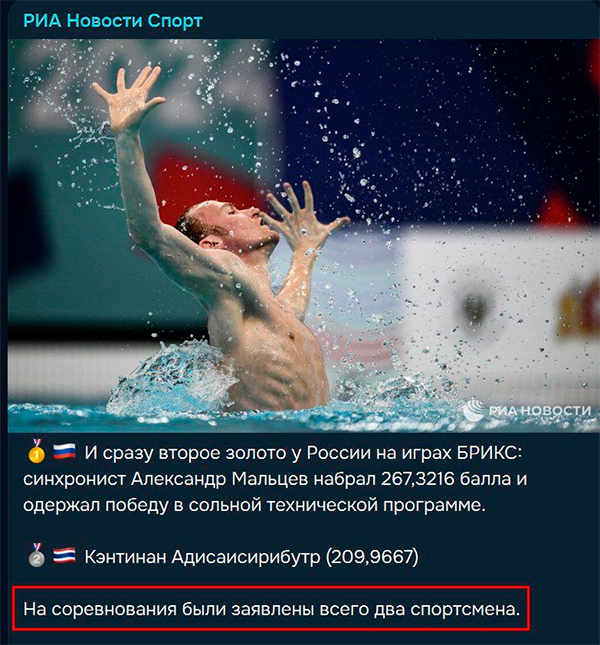 Так что эти игры, как вы понимаете, страшно представительные. Но они идут, и вот уже есть золото, завоеванное Александром Мальцевым в жесточайшей борьбе - на соревнования ему противостоял только один таиландец (в некоторых ТГ написали, что он соревновался один, но это не так - написавшие ориентировались на фразу "он выступал соло", но это только означало, что он выступал не в паре, потому что он вообще чемпион по синхронному плаванию).