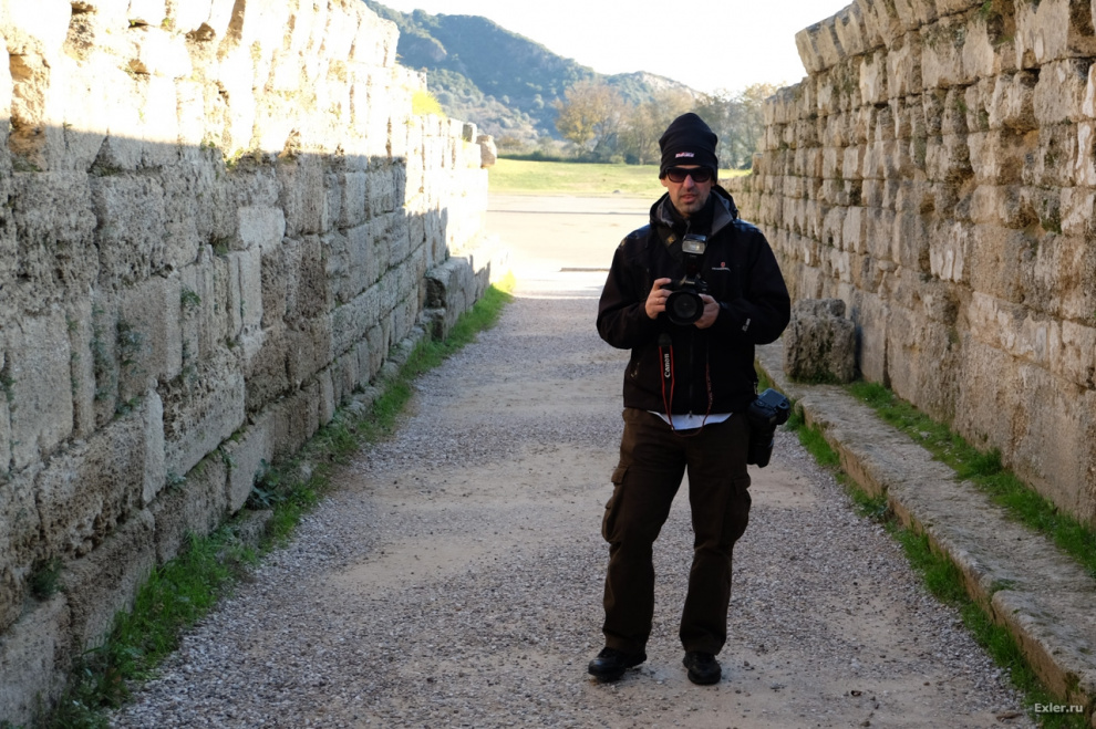В узком проходе стоит греческий фотограф, который требует по-олимпийски сгруппироваться, чтобы он мог сделать кадр.