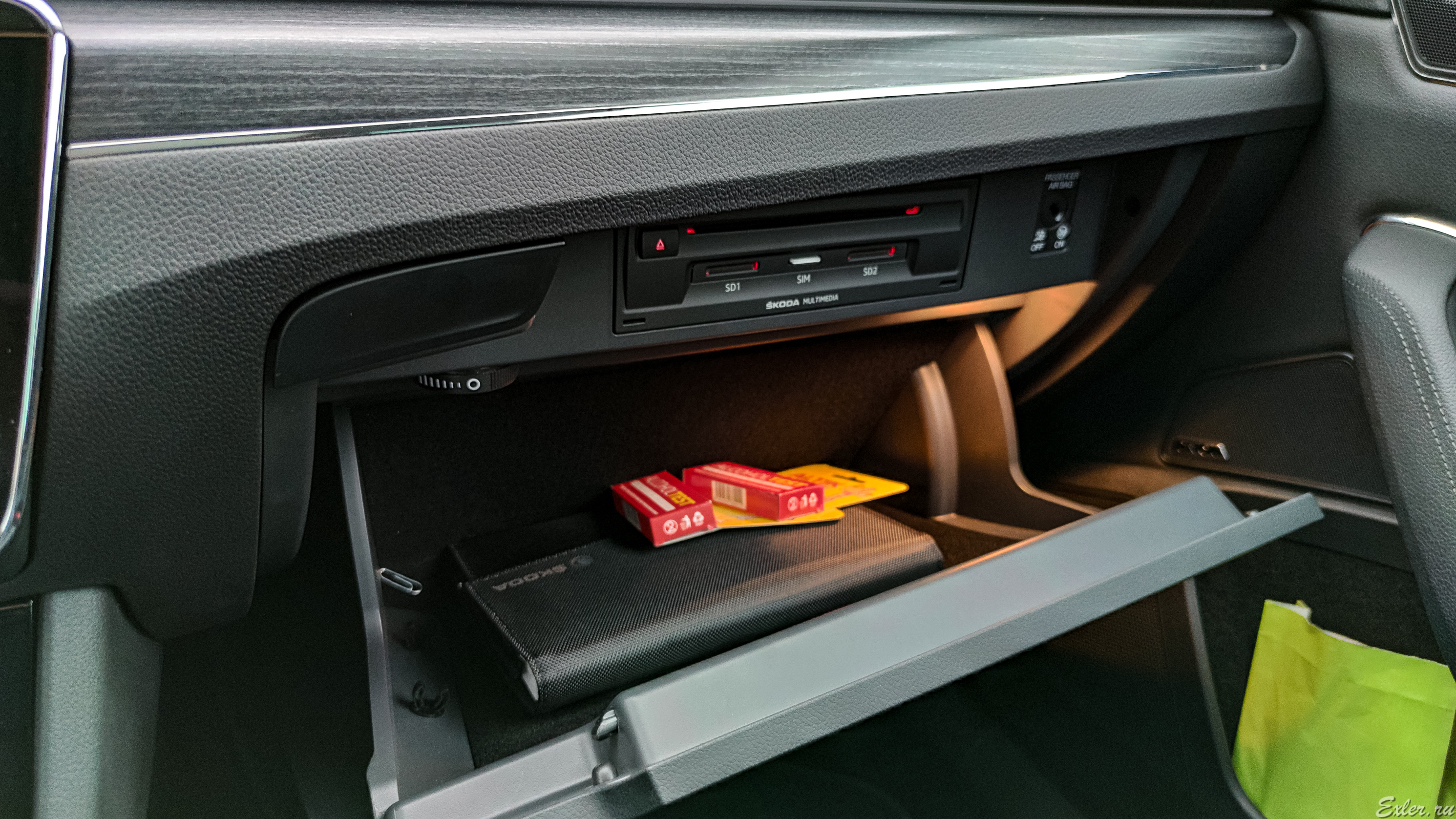 Отделение для перчаток - большое, вместительное, также здесь установлена система с поддержкой SD-карт, CD и симкарты (Интернета, навигационной системы, предупреждений, поиска заправок и так далее). Интересно, что у меня в Octavia тоже установлена штатная симкарта, но она Интернет не раздает, используется только для навигации, предупреждений о дорожной ситуации, поиска определенных объектов. (Абонентскую плату я при этом не плачу.)