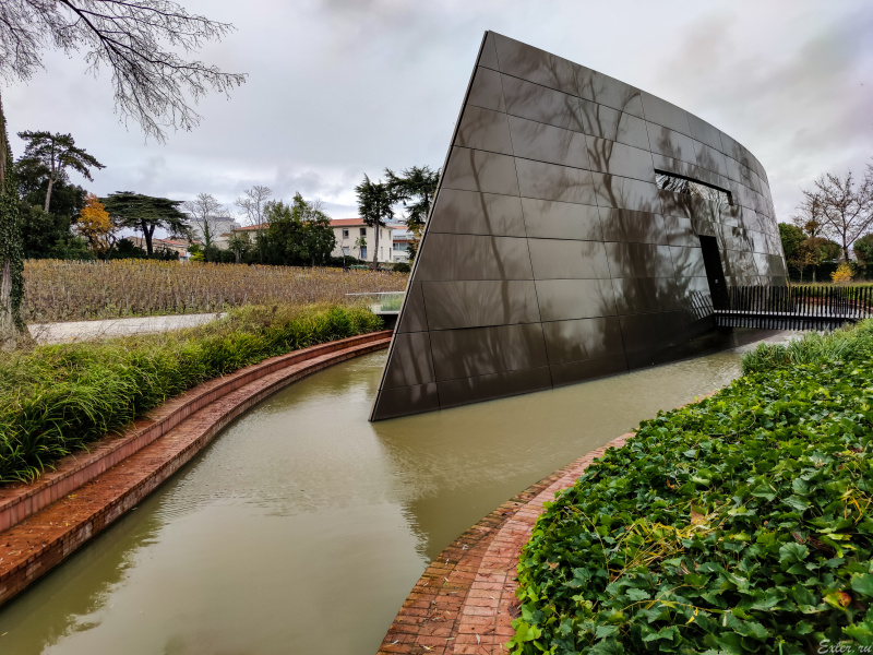 Винодельню проектировал сам Филипп Старк. Она похожа на подводную лодку, располагается в пруду и под землю уходит на два здоровенных этажа.