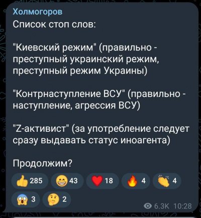 - Общее же ощущение от телеграм повестки z-сетки - хаос и неуверенность. События в России помноженные на ожидания скорого контрнаступления очень общественность нервируют. Эту мысль блистательно вчера сформулировал публицист Холмогоров: «Высказаться обо всем происходящем мешают душащее чувство презрения и осознание бесполезности этих высказываний».