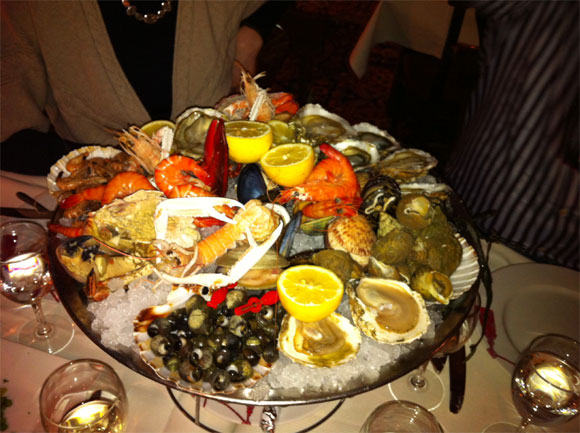 Ужинали в Grand Cafe Capucines. Название кафе дано не в честь капучино или монахов-капуцинов, а в честь цветка настурции. При этом ни одной настурции в самом кафе не было обнаружено. Зато в меню было полно морепродуктов, крутоны и дефлопе по-турински. Мы решили вдарить по морепродуктам, поэтому пили белое вино - совершенно замечательное. Начали вот с этого, после чего двигались по восходящей. Так полагается. Надо начинать с простых вин и двигаться к более сложным.