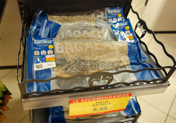 Вот эта штука называется "бакалао" - национальное блюдо Каталонии. Засоленная и высушенная треска. Продается в специализированных магазинах, причем это не обычные магазины морепродуктов, коих здесь полно, а специальные магазины, где продается только подобного вида рыба, подготовленная традиционным способом.