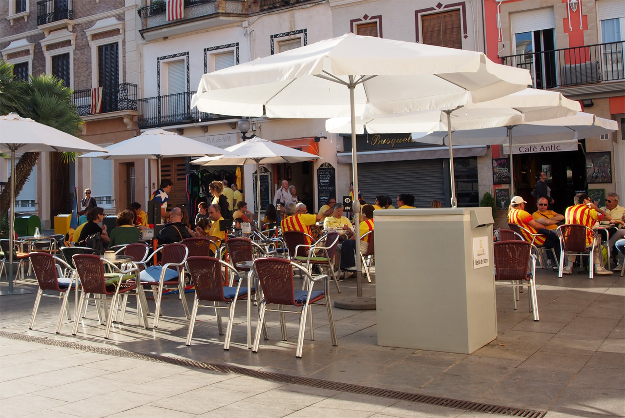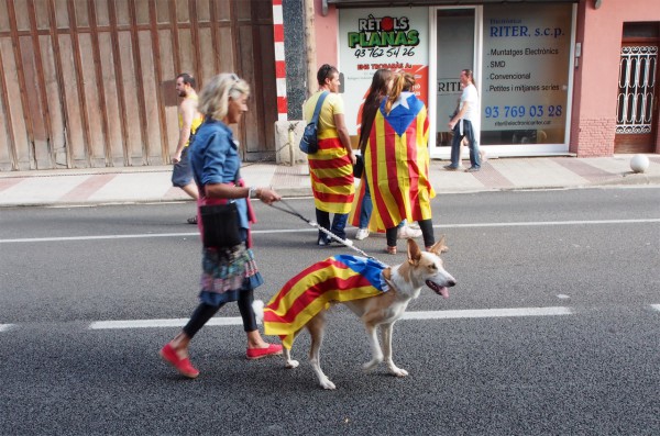 В нашем городке Национальный день проявился в том, что с самого утра местные жители вывесили в окнах каталонские флаги (вообще они тут и так постоянно висят в каждом третьем-пятом окне), а потом вышли в город, причем все, включая школьников, были одеты в майки с каталонской символикой, а очень многие несли на плечах в качестве плаща каталонский флаг.