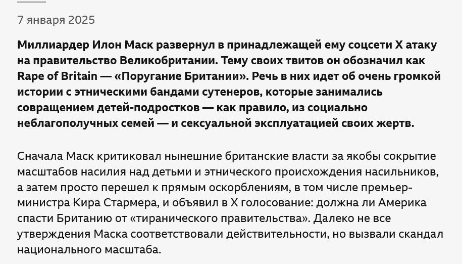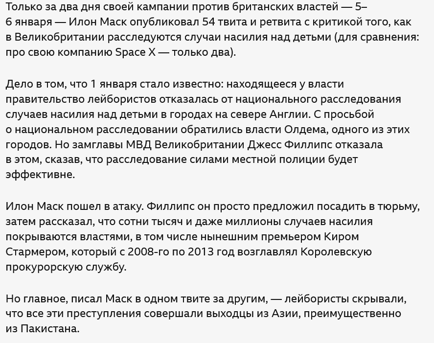 Таким образом, И.Маск, хоть и в провокационной и просто грубой форме, вновь сделал больную для Британии тему сексуальной эксплуатации детей чуть ли не главной на сегодняшний день.