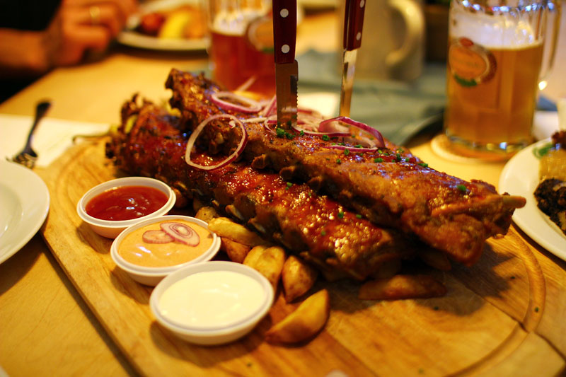 Стейк плюс гарнирчик (картофель разного вида или спаржа). Уже упомянутые креветки. Лососина с соусом и гарниром. Наконец, свиные рёбрышки, просто рёбрышки (разумеется, с приправами и гарнирчиком), что из Salm Bräu в Вене. И фсё!