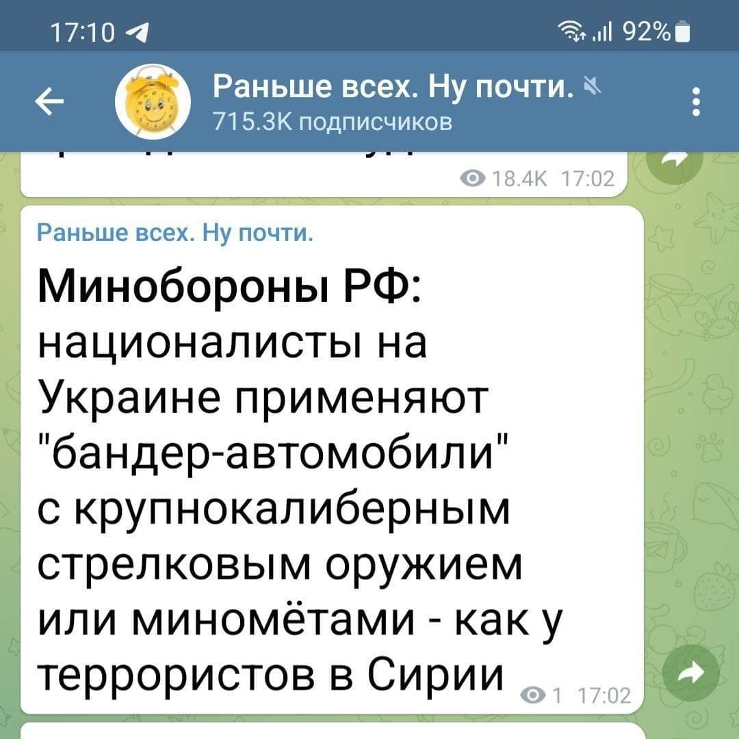 :-)) тут прекрасно все! и про вчерашний приказ, и про бендеромобили! и про то, что несмотря на приказ, кое где бои продолжались.... еще капельку и увидим, что еще 24-го днем Путин отменил операцию, а все дальше - это просто преследование банд нацистов, которые спровоцировали российскую армию на границе 😉
