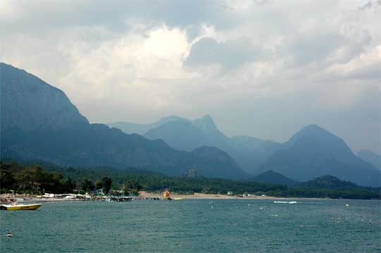 Кемер - горный район, в отличие от Белека-Сиде-Манавгата, потому тут значительно красивее - морской залив окружен горами. Но по той же причине в Кемер не рекомендуется ездить в мае - в это время здесь еще прохладно, и море совсем холодное, хотя в том же Белеке уже вполне можно купаться.