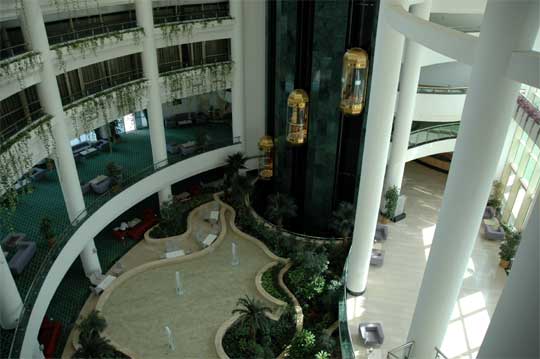 Kemer Resort понравился. Территория у него, правда, небольшая (впрочем, в Кемере у всех отелей совсем небольшая территория - все-таки горы), но использовали они ее вполне эффективно. Сам отель - здоровенный и, как бы это сказать, богатый: лобби, как это обычно делается в крутых отелях, представляет собой помещение, уходящее вверх под самую застекленную крышу пятого этажа. Кроме того, внизу, где огромный ресторан, полно отделанных мрамором помещений, в которых просто стоят кадки с цветами - для красоты. И там ничем не торгуют и ничего не продают. Просто помещения и эркеры - чтобы было.