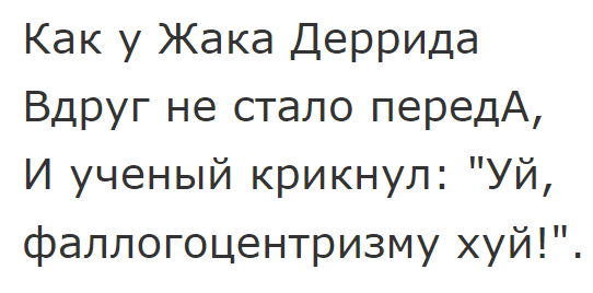 И еще. В приличном обществе обсуждение вслух третьего лица в формате "шо там оно провякало?" если лицо это слышит - абсолютное некомильфо* вне зависимости от употребляемого местоимения. Переспросите их лично. А если не слышит - опять же совершенно пох, ибо нельзя оскорбить ся не услышав. Так что единственное разумное объяснение этому they вместо традиционного (и абсолютно гендерно-корректного) that person - тупо ленивая экономия букв.*быдлячество