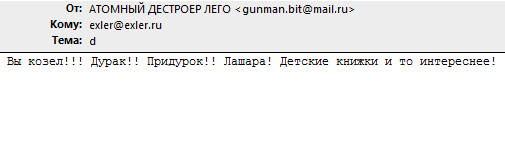 Судя по никнейму в почте "атомный дестроер лего" это просто напросто ребенок, и шутак йумара экслера он не понимает;)