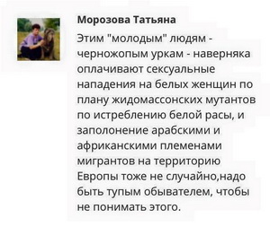 az: план жидомассонских мутантов - это понятно. а вот кто конкретно оплачивает -непонятно. а черножопые урки вообще зажрались. мало того, что по плану ЖДМ они должны делать сексуальные нападения на белых женщин, так им еще и платят за это.