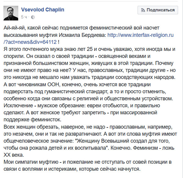 ikkipapir: А что, православно, и я бы даже сказал духовно-скрепно.. Предлагаю женское обрезание начать с росеянских депутатш -- Мизулиной и Яровой..