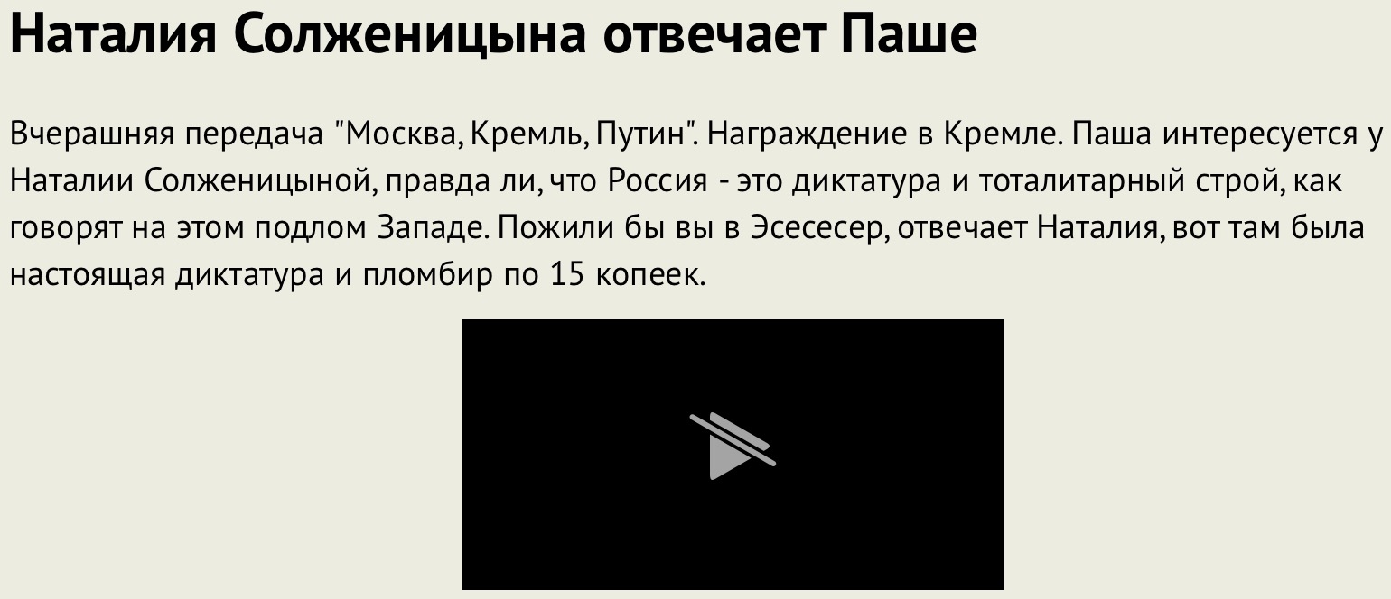 Вчерашняя передача "Москва, Кремль, Путин". Награждение в Кремле. Паша интересуется у Наталии Солженицыной, правда ли, что Россия - это диктатура и тоталитарный строй, как говорят на этом подлом Западе. Пожили бы вы в Эсесесер, отвечает Наталия, вот там была настоящая диктатура и пломбир по 15 копеек.
