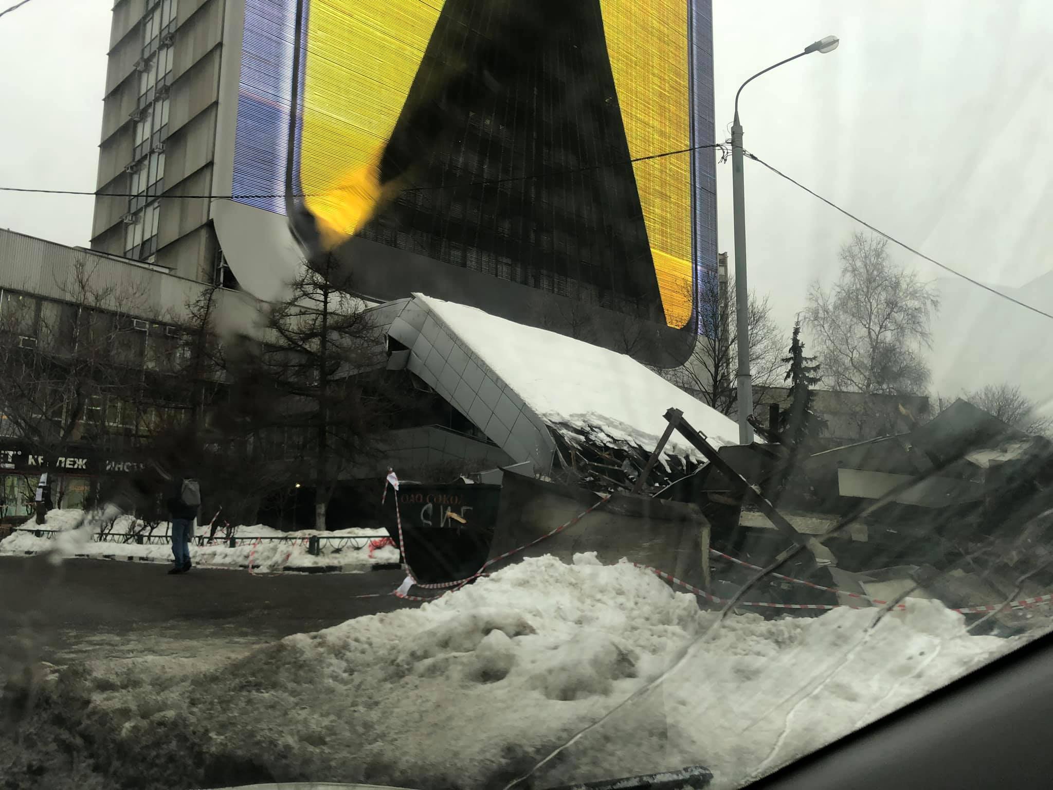Рухнул навес над центральным входом здания "Гидропроект" на "Соколе" в Москве. (Отсюда.)