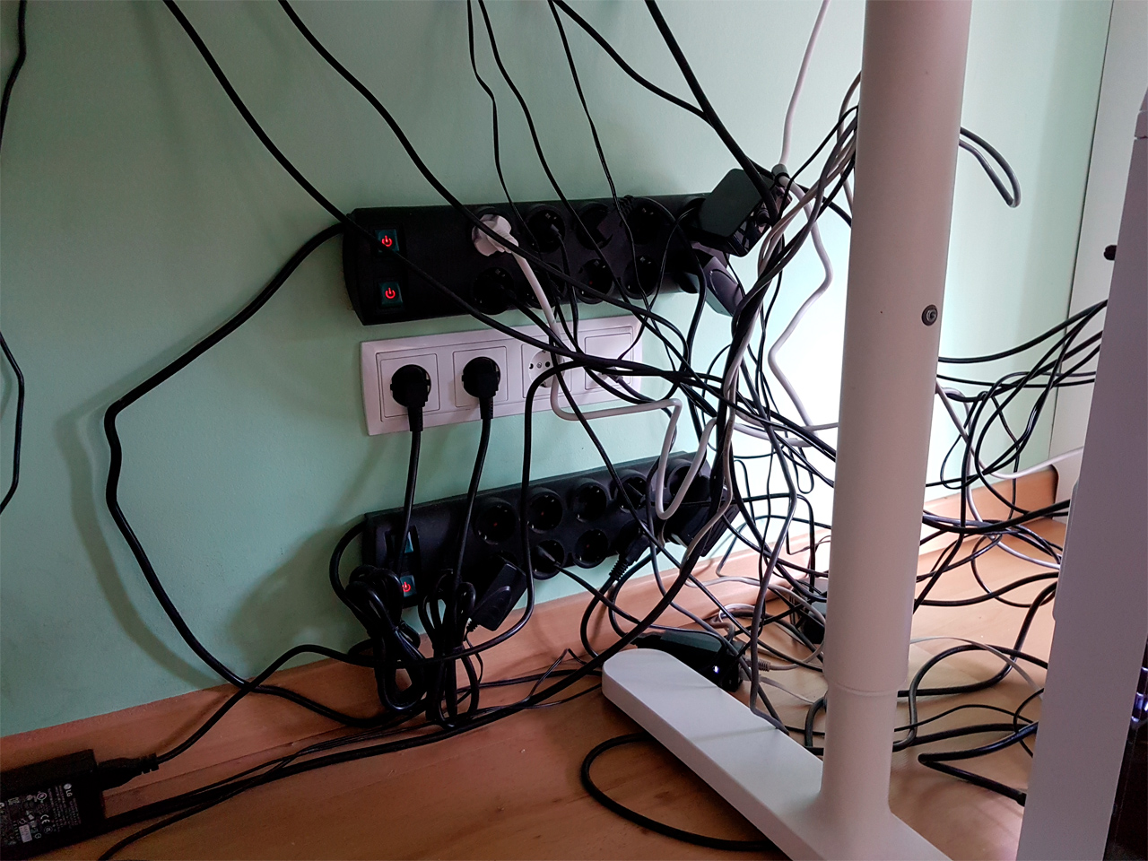 У меня телевизер ЖК 47", на тумбе, вот за ним такой же ад, там и роутер, и внешний ЖД сетевой, и принтер, и AppleTV, и как-то это все соединено. Примерно как вот на исходном фото 😄
