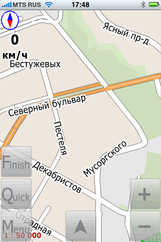 Врубить отображение пробок мне не удалось (надо писать разработчикам и просить у них какой-то логин-пароль), но не очень-то и хотелось - все равно на программах навигации пробки смотреть реально неудобно, а составлять маршрут с учетом пробок - ну, это разве что для того, кто город не знает вообще. Да и даже если не знает - все равно полагаться на навигатор в этом плане смысла не имеет.