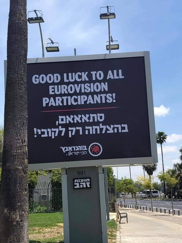 На английском написано: "Успеха всем участникам "Евровидения"!" На иврите - "Шутка, желаем успеха только Коби" (Коби Мерими - представитель Израиля).