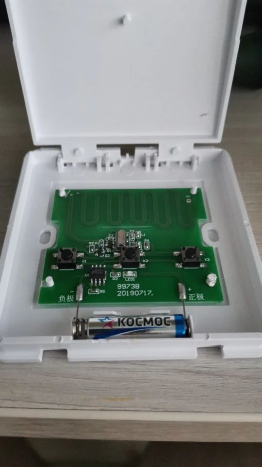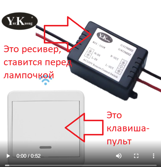 Любой пульт на рабочую частоту, приемный модуль - обучаемый, там кнопочка нажимается и он запоминает дополнительный пульт. А большой белый "выключатель" по сути является пультом, никакие провода к нему не подключаются, и унутре батарейка, можете не клеить на стену а таскать в кармане. 😄. Только я бы вам посоветовал взять версию на 433Mhz а не на 315, если только не в США живете. А можете еще и пультик взять обучаемый, в него можно вдуть 4 таких выключателя или один этот и еще три каких-нить радиоуправляемых дивайсов, тогда даже кнопку в коробке нажимать не придется, этот пульт сам обучится от "выключателя" - aliexpress.ru