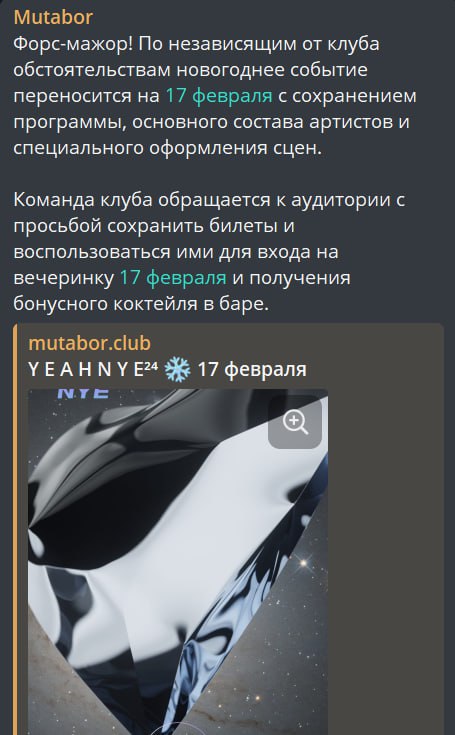 В клубе должна была проходить новогодняя вечеринка, за которую взяли деньги, так теперь объявили, что новогодняя вечеринка переносится на 17 февраля - приходите, отметим!