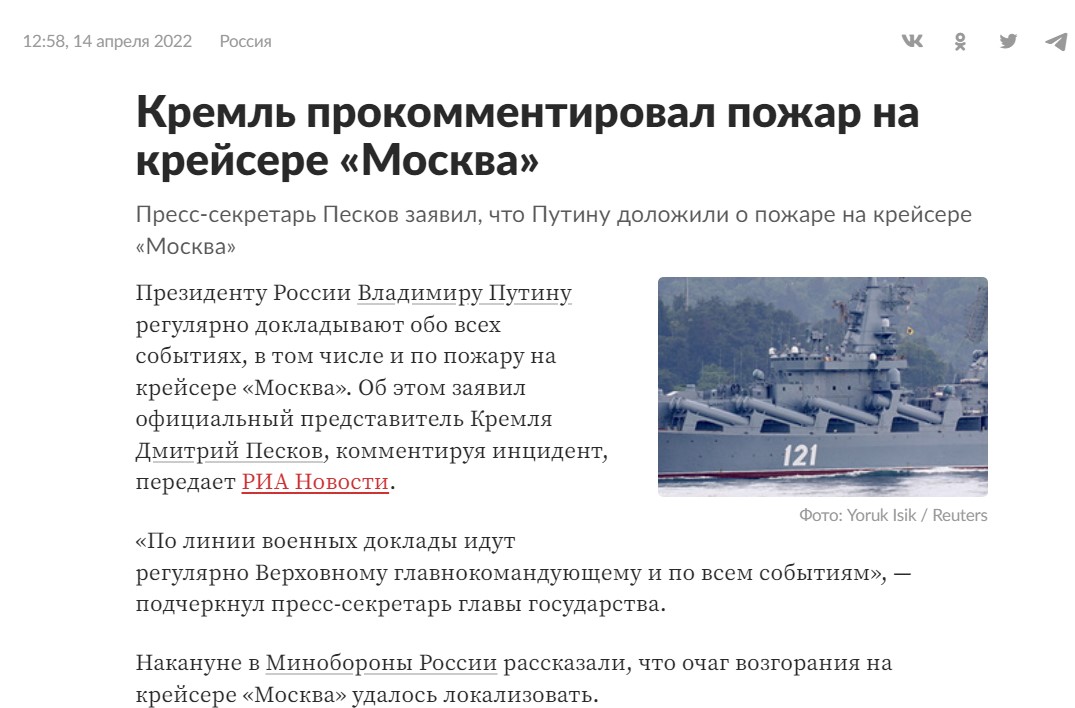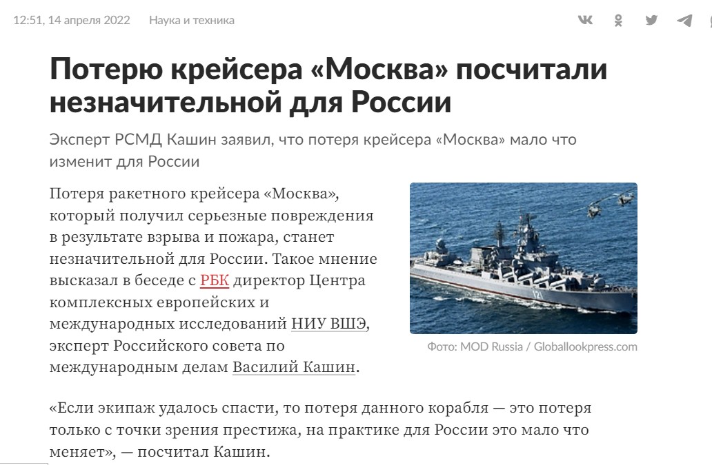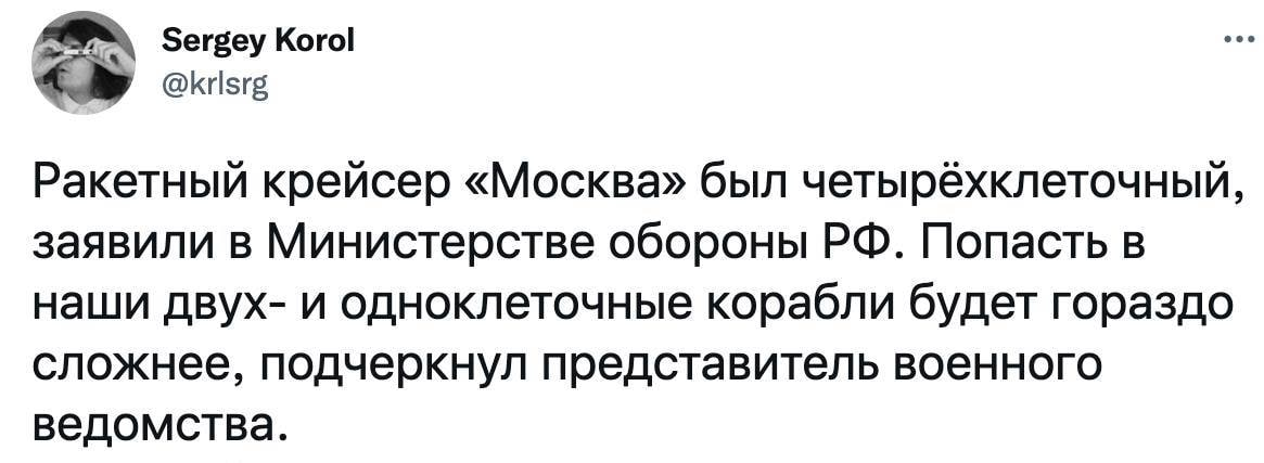 Как пишут в различных телеграм-каналах, новости о "Москве" все время менялись и корректировались. То детонация боеприпаса, то детонация боезапаса, то экипаж полностью эвакуирован (обычно это означает, что корабль затонул), то теперь слово "полностью" пропало. На сайте Минобороны, что интересно, об этом вроде вообще ничего пока не сообщается.