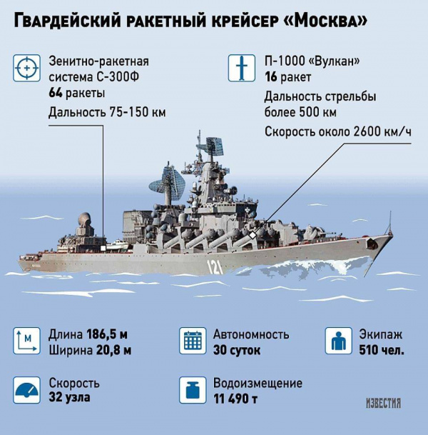 "Москва" - флагман Черноморского флота, головной корабль проекта 1164 "Атлант". Введен в эксплуатацию в 1983 году под наименованием "Слава". В 1996 году крейсер получил свое нынешнее название. Основное ударное вооружение корабля составляют 16 пусковых установок ракет П-1000 "Вулкан". (Отсюда.)