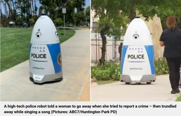 Заметочка не слишком новая, но раньше не попадалась, и я не думаю, что с той поры роботы-полицейские заметно улучшили свои навыки - "Police robot told woman to go away after she tried to report crime – then sang a song".