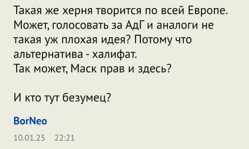 Браза, я тебе скажу что в моем "диалоге" с Стебандером Вайдель вобще не упоминалась, и современная Германия не упоминалась, и вобще началось с Трампа и США(см. комент Мити78).