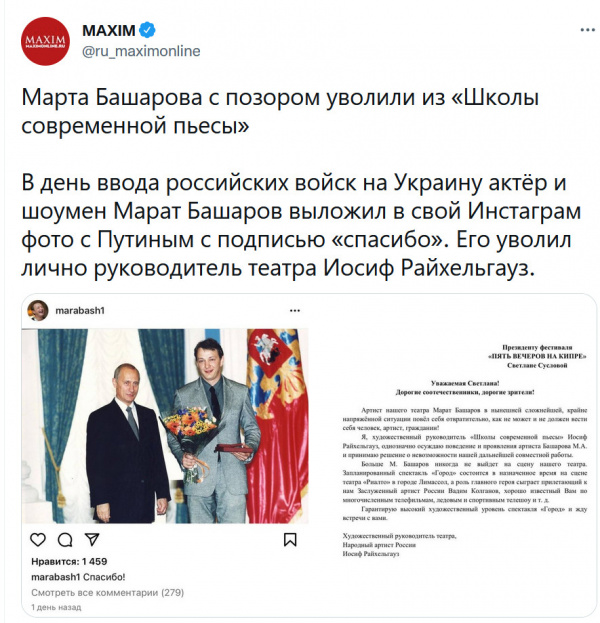 Я, художественный руководитель «Школы современной пьесы» Иосиф Райхельгауз, однозначно осуждаю поведение и проявления артиста Башарова М.А. и принимаю решение о невозможности дальнейшей совместной работы» - гласит письмо.