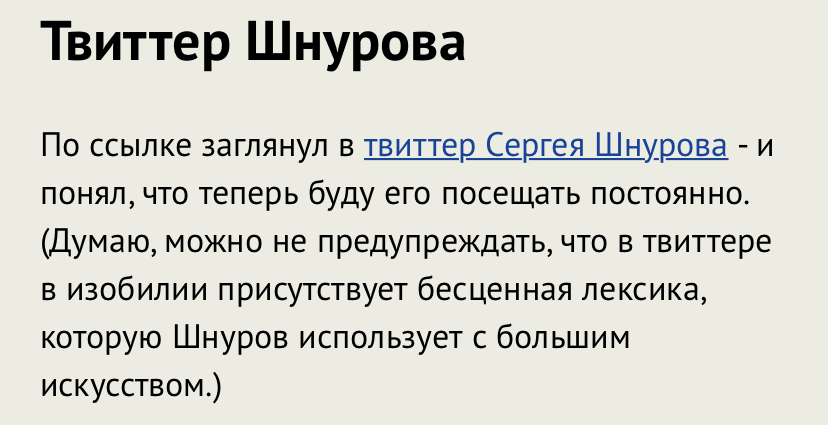 Ну, и что до творчества Шнура, то после Константина Николаевича Беляева, который, как никто другой, мог так элегантно обращаться с обсценной лексикой, что дух захватывало, или после "Куплетов про ансамбль Березка" Виктора Темнова, всё творчество Шнура мне изначально казалось скучным и вторичным Опять же, мое субъективное мнение