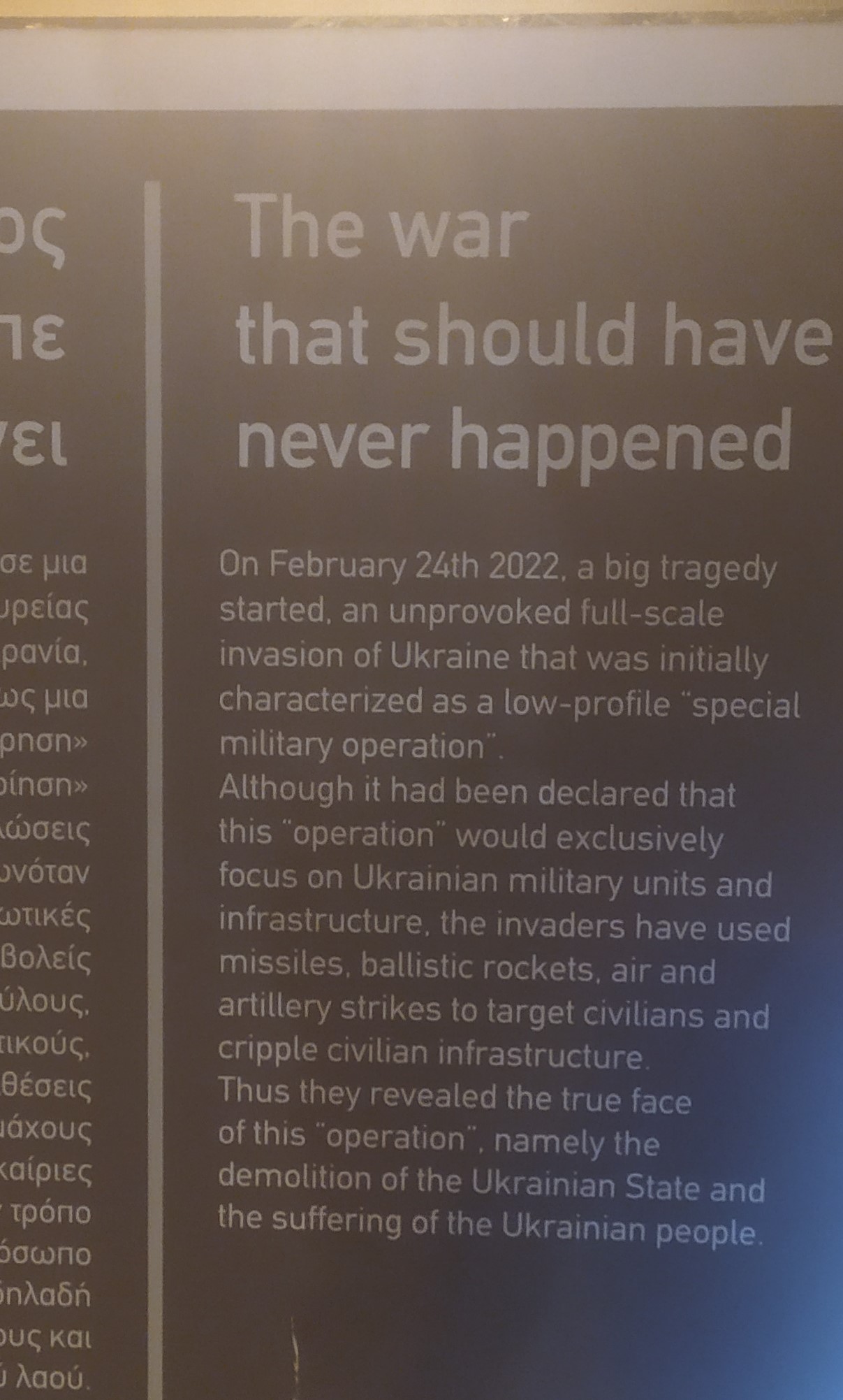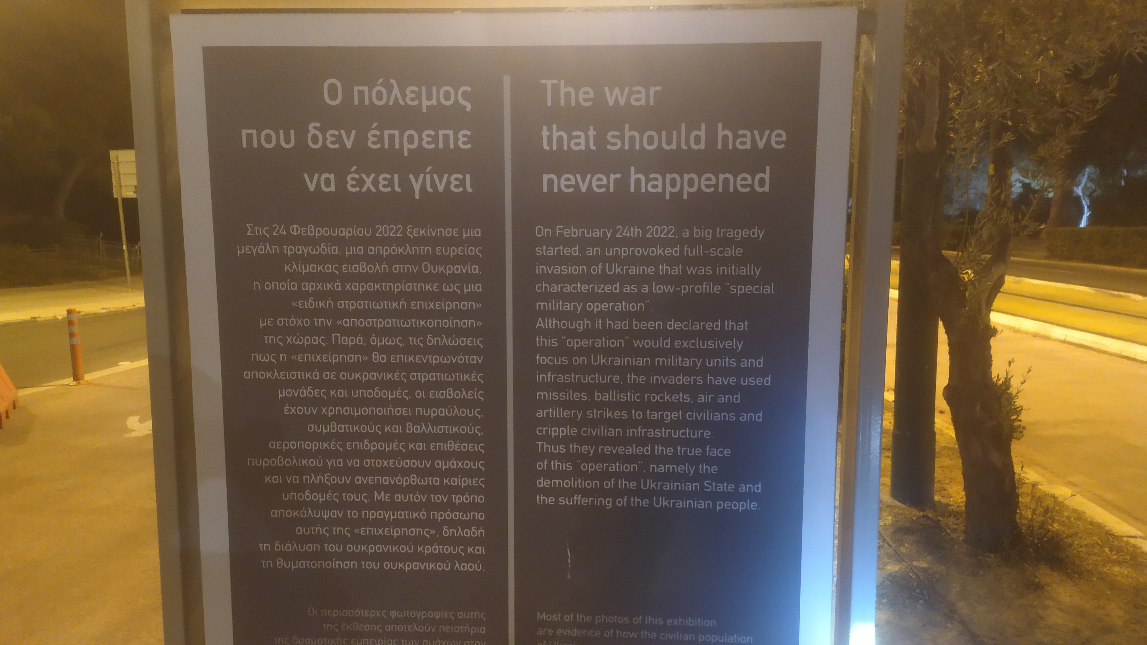 И вот ещё ночью ехал по Афинам и увидел таблички с фотками ужасов из Украины. Фотки вы видели , постить не буду, а вот надпись от Мэрии Афин: