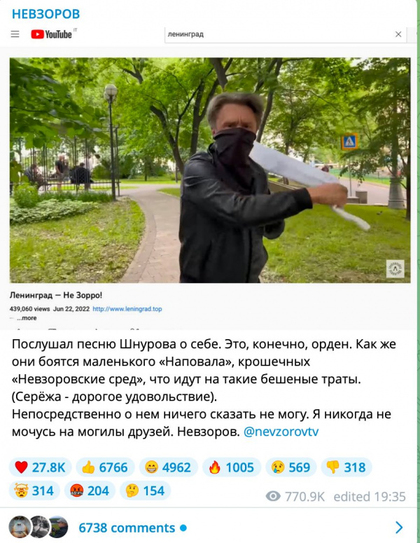 Существо по имени Шнур выпустило песню и клип "Не Зорро", посвященные Александру Невзорову, с которым раньше, напомню, Шнур был в больших друзьях.