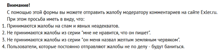 1. Для кнопки "Пожаловаться на коммент" добавили пояснения. А то развелись любители жаловаться на всех и вся, двоих уже забанил. Этот текст теперь появляется в форме жалобы.