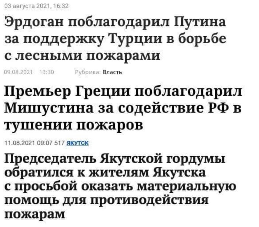 Не оправдывая ситуацию в Якутске (вам на всю Якутию с которой все началось уже наплевать?) и для предметной претензии уточните, что делается для тушения пожаров в 60 км от Якутска, как помогли бы там самолеты находящиеся сейчас в Турции и Греции и могли бы они там использоваться, базироваться и обслуживаться. А пока это тупой плакатный лозунг - у нас горит, а тушат там. Плохо, что горит и нужно решать, но связи с самолетами там может не обнаружится от слова совсем.
